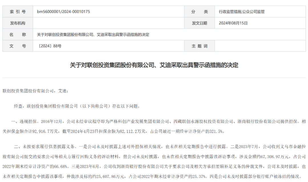2024年8月,由于违规担保以及未按要求履行信息披露义务,山东证监局对联创集团及相关人员艾迪出具警示函,并记入证券期货市场诚信档案数据库。